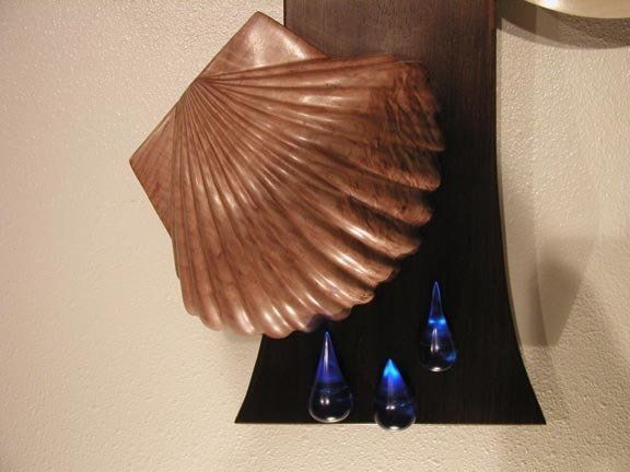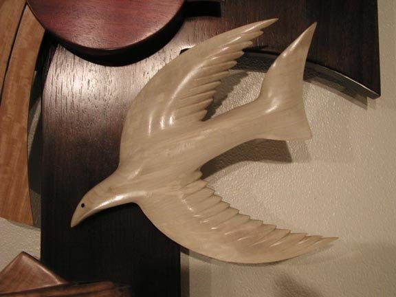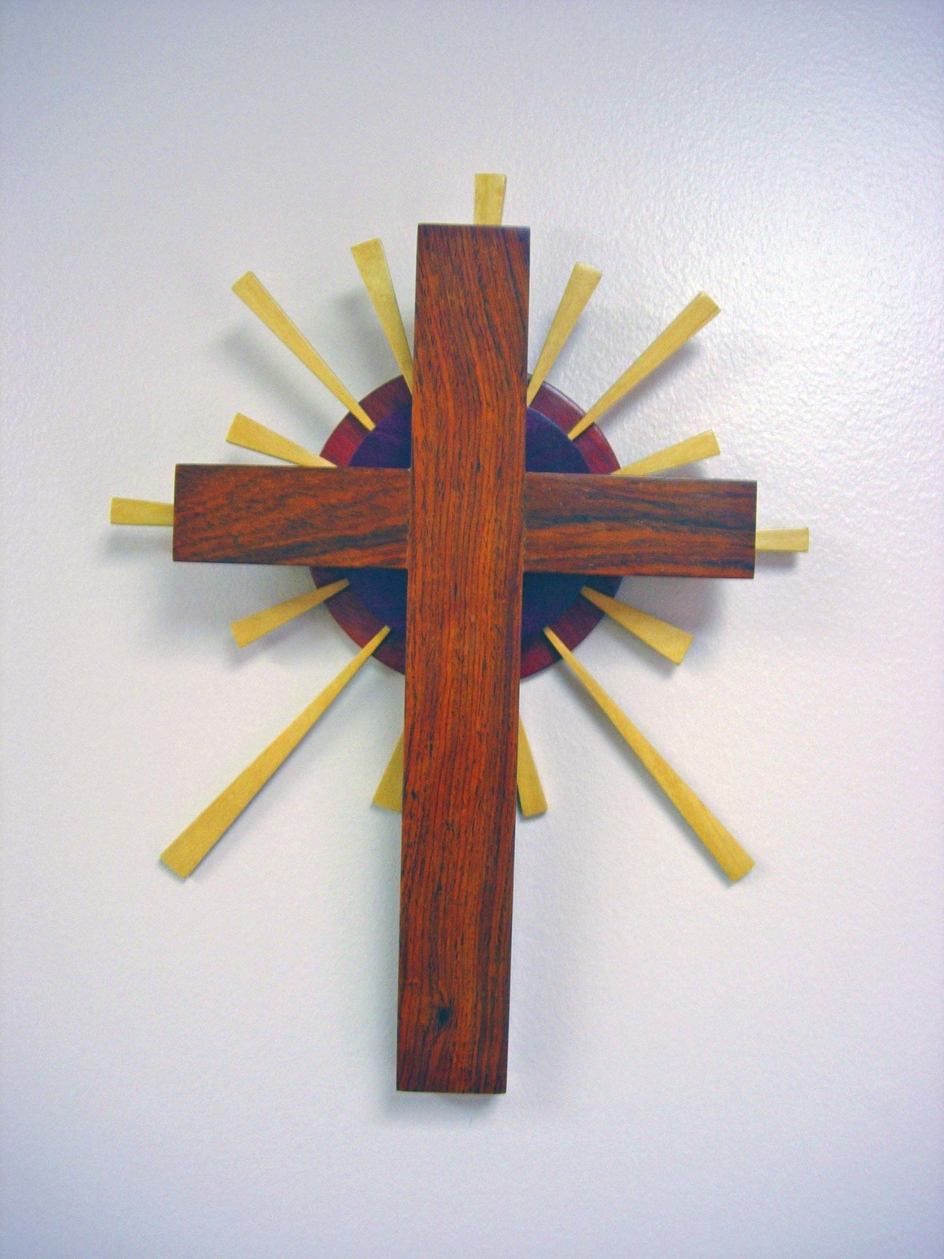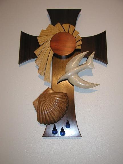 Commissioned for the Saint Paul Lutheran Church the cross stands 3 feet tall. The cross is made of Peruvian Walnut; the sun is made of Bloodwood and Satinwood. The dove is carved of Black Birch and then bleached and the eye is inlaid Ebony. The shell is carved of Maple Burl and the water droplets are blue acrylic turned and polished on the lathe. The following close-up were taken to show the detail that was put into the carvings