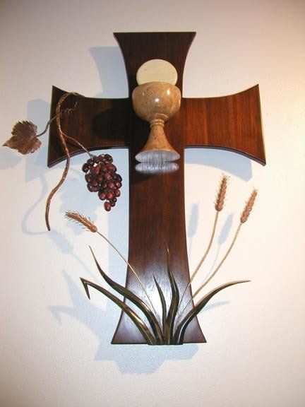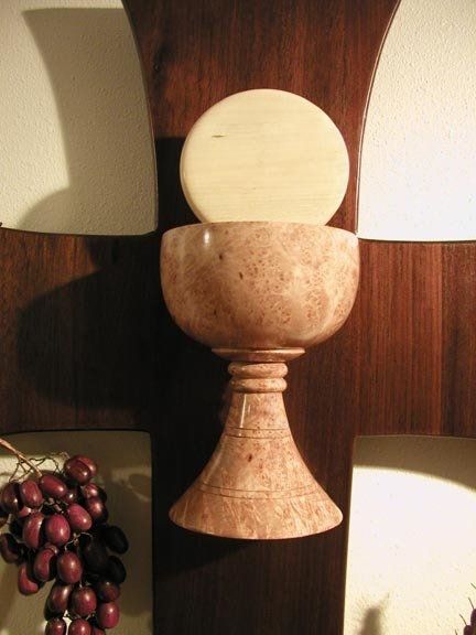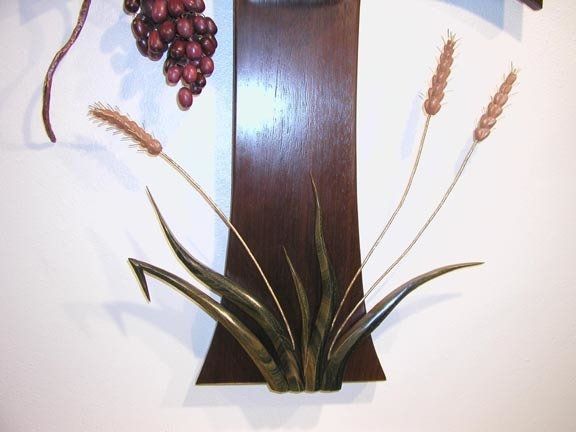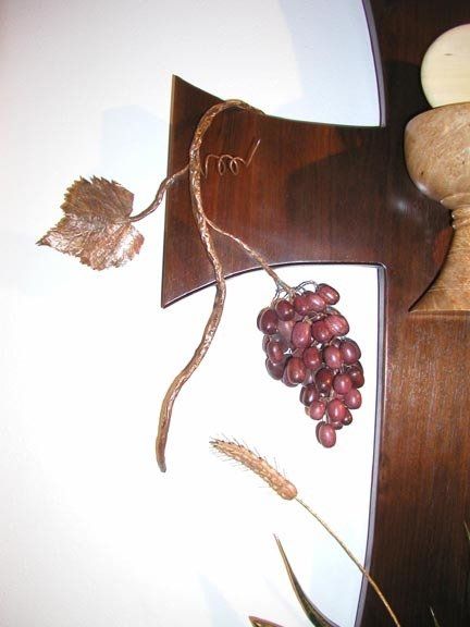 Commissioned for the Saint Paul Lutheran Church the cross stands 3 feet tall. The cross is made of Peruvian Walnut. The challis is made of Maple Burl and the host is made of Hollywood. The grapes are made of Purple Heart and hang on copper stems and copper leaves. The wheat leaves are made of Vera wood and the shafts of the wheat are made of brass and carved Lace wood heads. The following close-ups were taken to show the detail that was put into the carvings